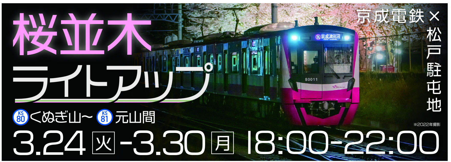松戸線くぬぎ山駅~元山駅の線路脇にある桜並木約50本のライトアップを実施します