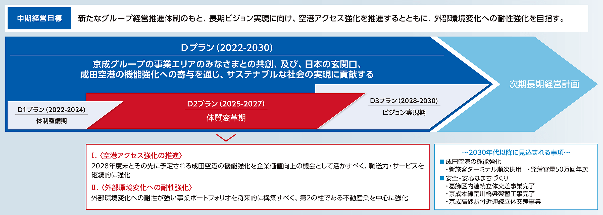 京成グループは、長期ビジョンの実現に向けて、新たなグループ経営推進体制のもとで中期経営計画「D2プラン」を策定しました。本プランでは、2028年度末に予定される成田空港の機能強化を見据えた「空港アクセス強化の推進」「外部環境変化への耐性強化」を柱としています。成田空港の機能強化に対応した輸送やサービスの継続的な強化に加え、「第2の柱」である不動産業を中心に事業エリアの生活ニーズを捉える事業やエリア競争力への寄与が期待される事業の強化を進め、企業価値の向上と安定した収益基盤の確立を図ります。