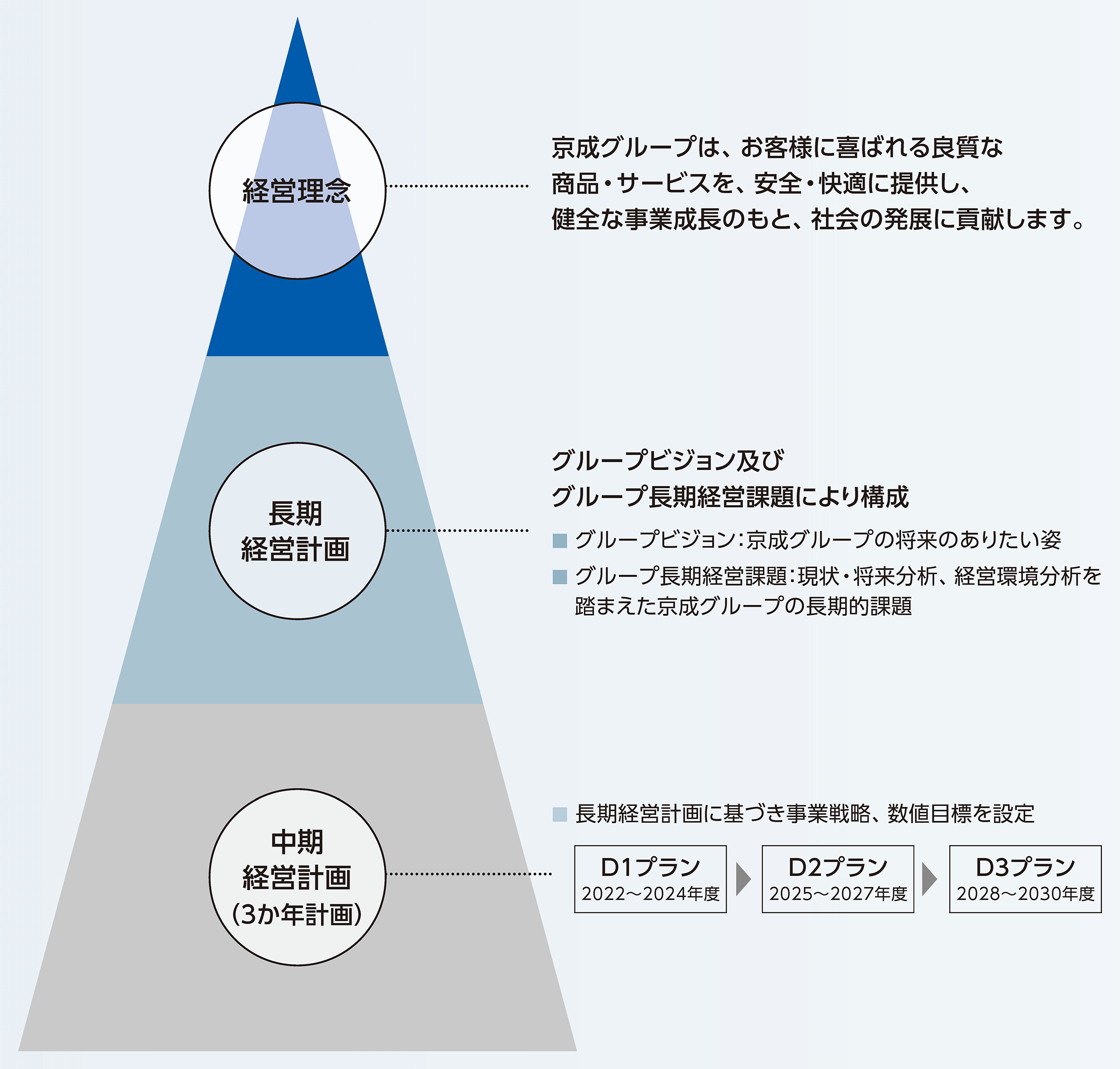 京成グループでは、2022~2030年度の9年間を計画期間とする、長期経営計画「Dプラン」を推進しており、京成グループの将来のありたい姿を、2030年におけるグループビジョンとして以下の通り定めています。そしてグループビジョン実現に向けて設定した「長期経営課題」に基づき、各重点施策を実行します。